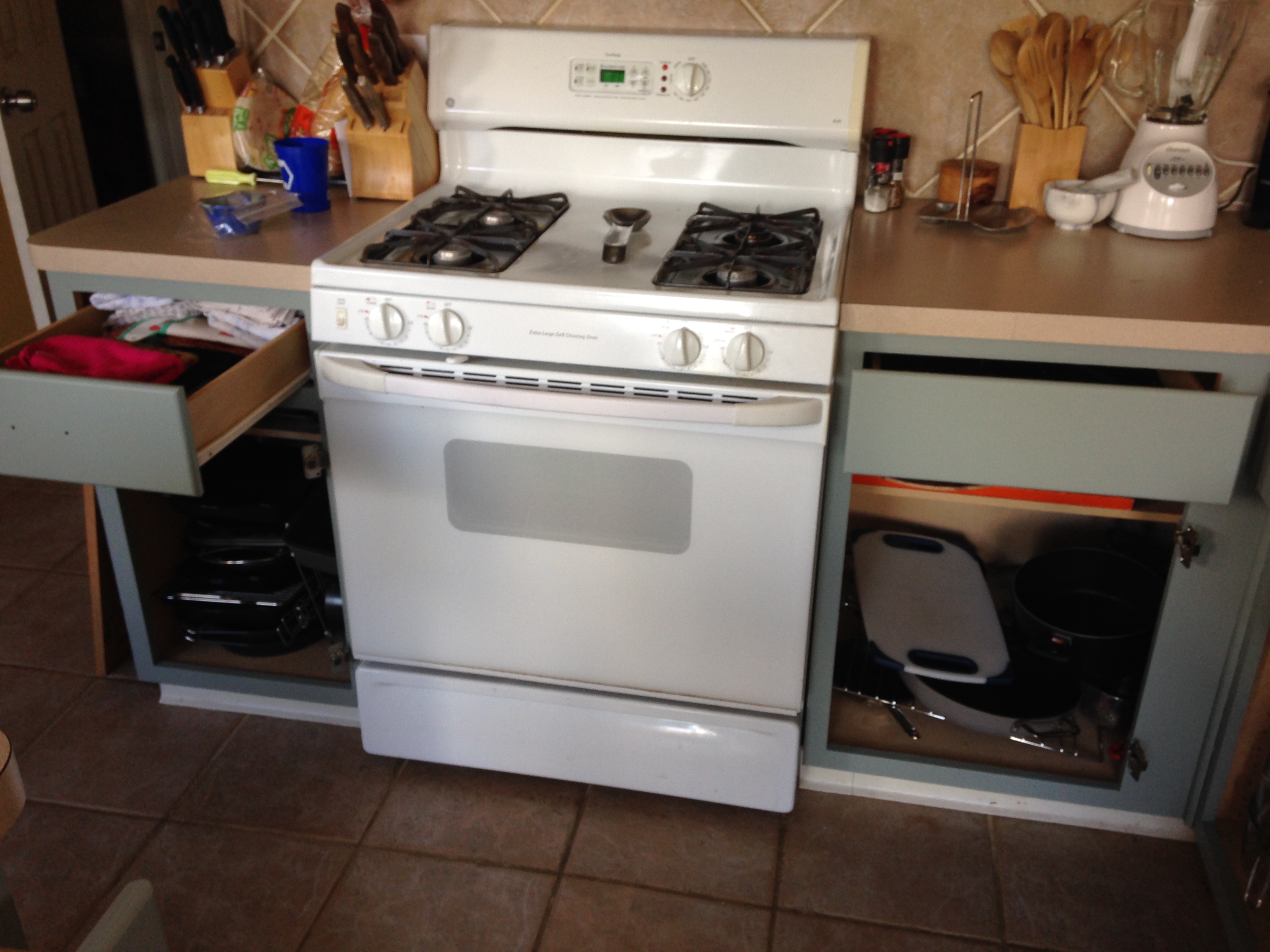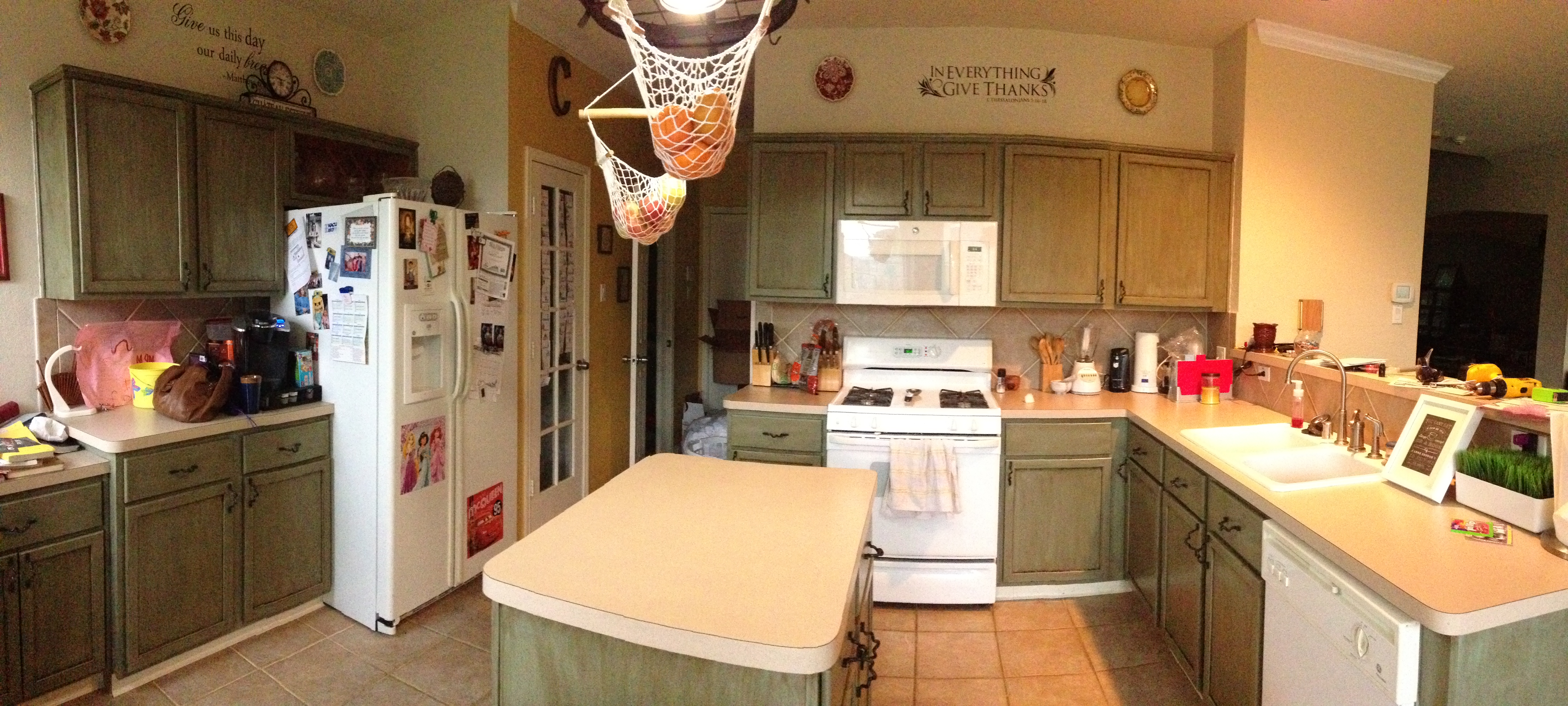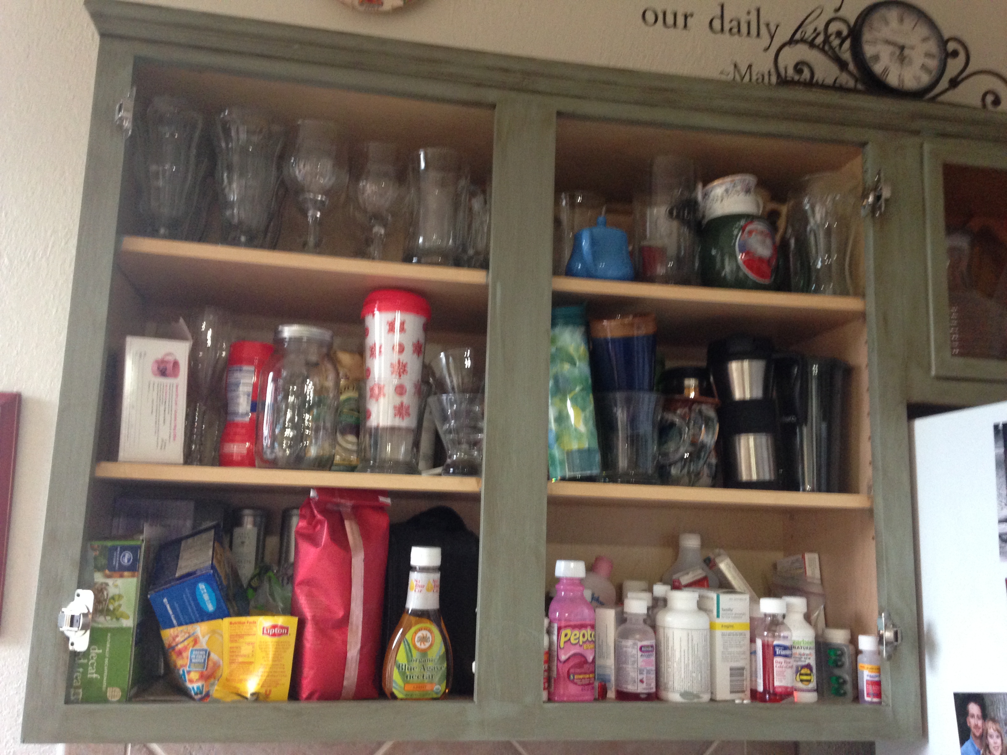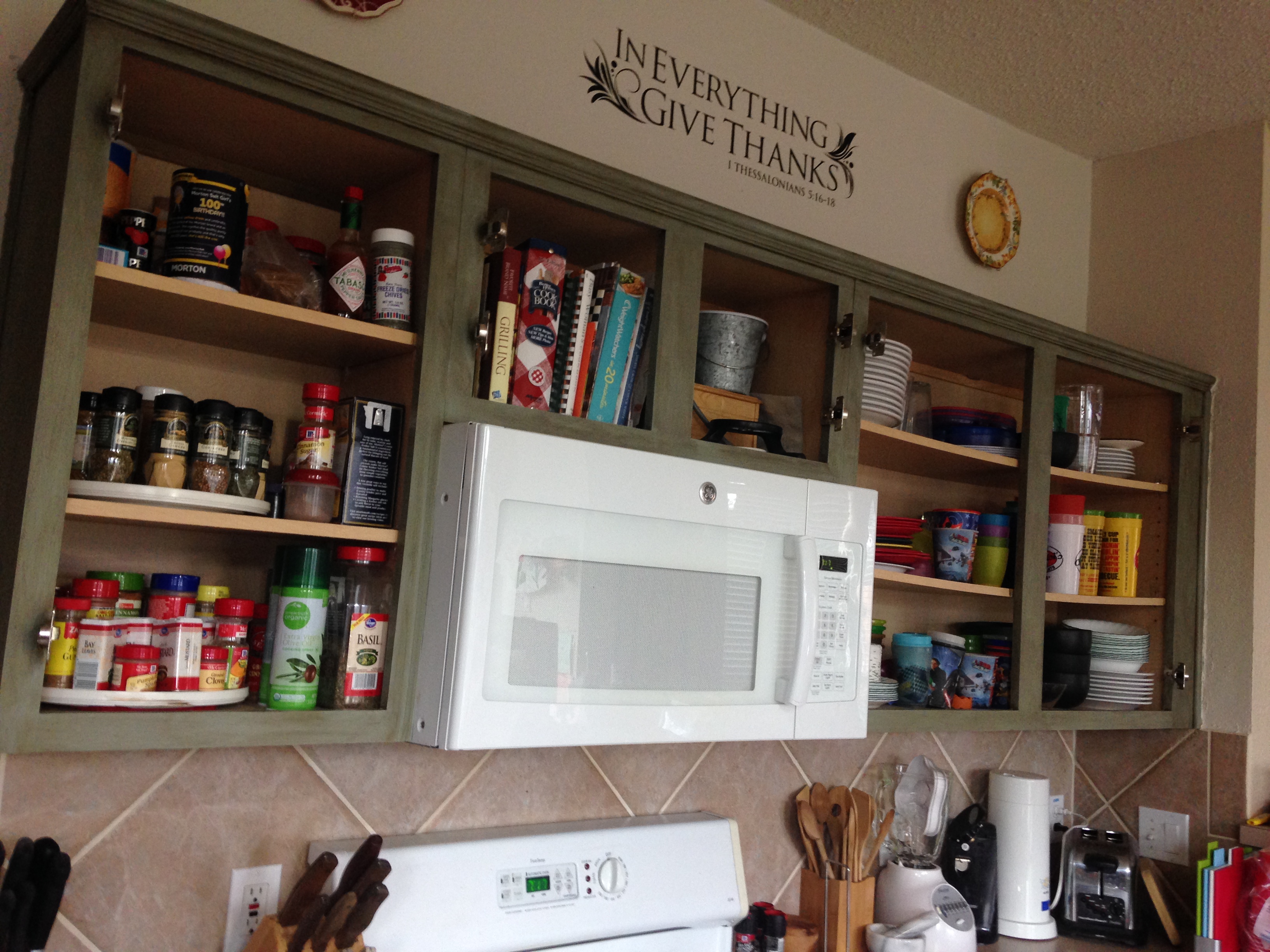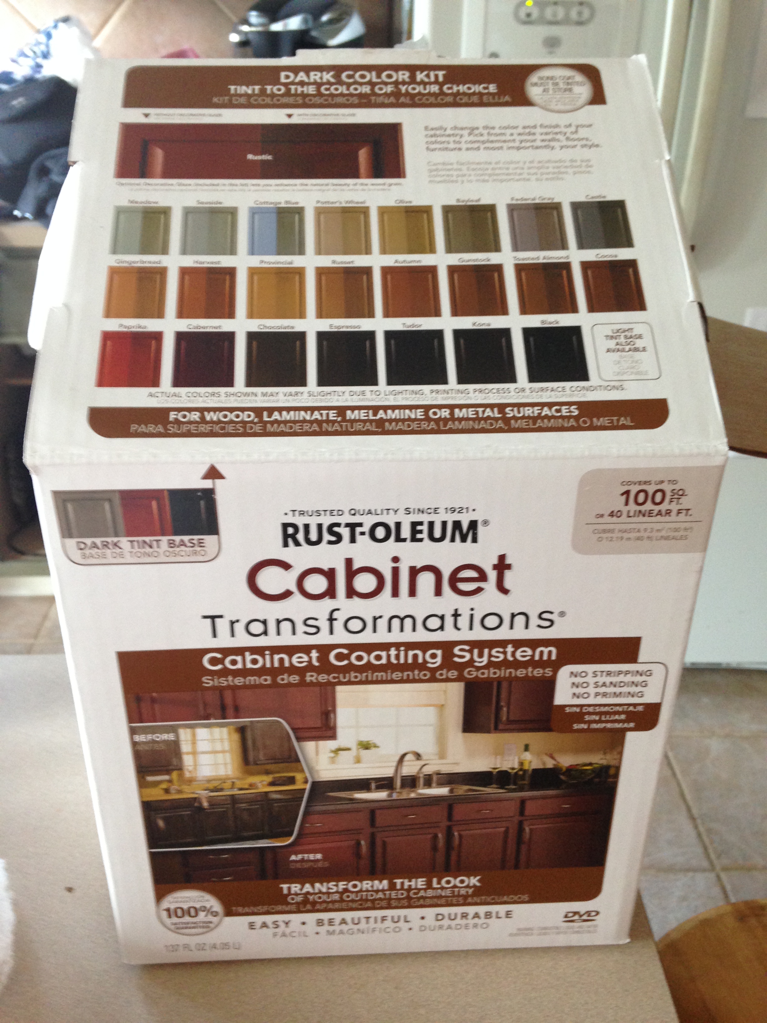 Well, that ruined my plan completely! So I stood there just looking at the guy wracking my brain about what I was going to do next. The guy obviously saw that I was in a panic and my mind was racing, and he jumped at the chance to help me out before I went ballistic in the aisle or started crying! So, he told me about Rustoleum’s Cabinet Transformation kit. I checked it out and then had to leave to think about it for a few days. I really needed to make sure that was exactly what I wanted since my previous plan of chalky paint had gone by the wayside. I’m not one for spontaneous purchases, so I had to take time to think about it and do more research. I finally decided to go ahead with the kit and returned to buy it. I decided to go with the Meadow color since I was wanting my cabinets to end up a green color.