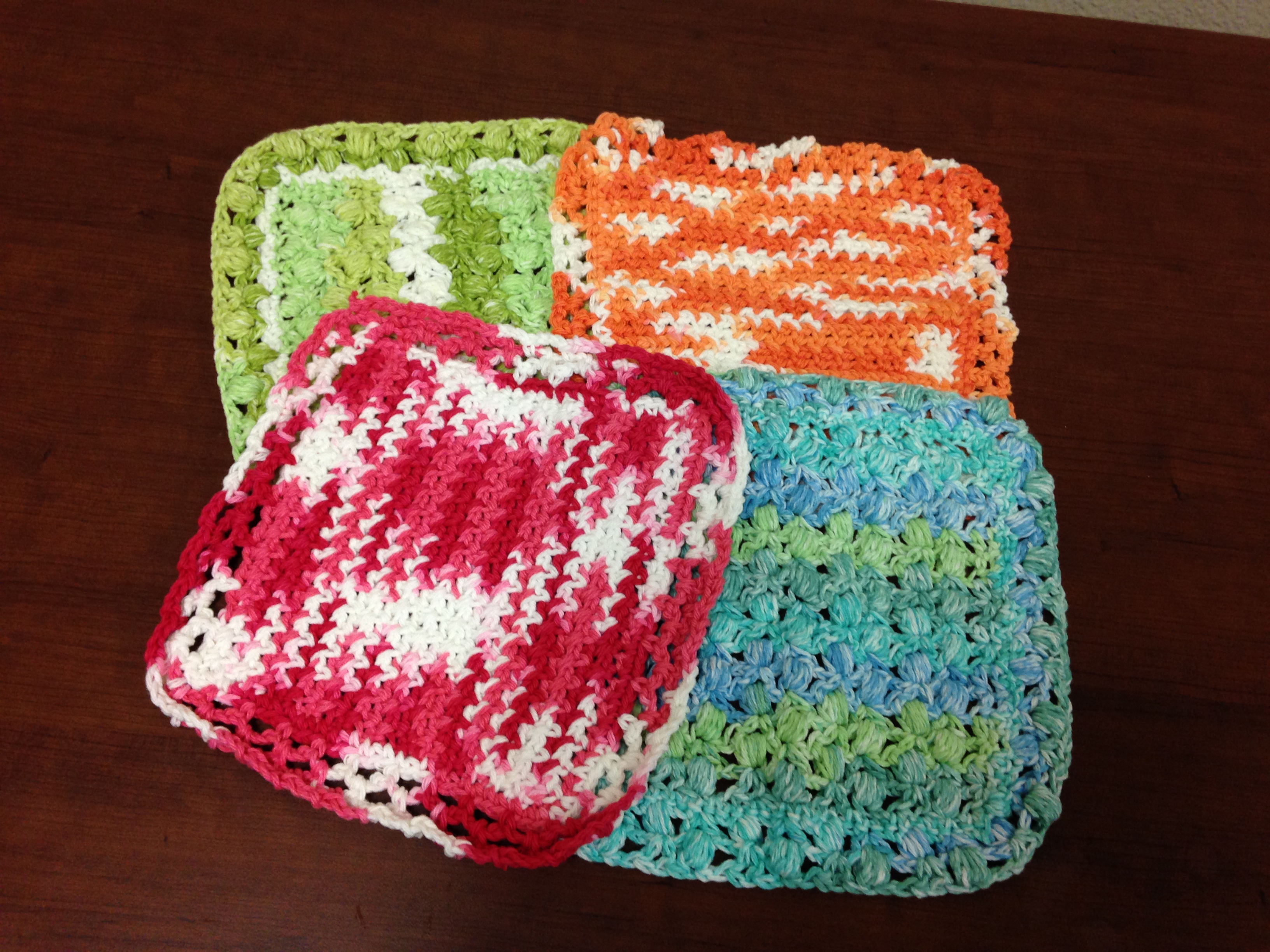 You see, about a month ago, my family went to Ham’s Peach Orchard in Terrell, TX and they had handmade dish cloths for sale. I was like “I can make those!” and filed it away in my head for a project at some point. Then last Friday, my mom and I went to check out the Mesquite Quilt Show (shout out to Beth & Evelyn!!). A vendor there had these cloths too, and I was hooked! I had to make them! I made a beeline to Michael’s on Friday afternoon to get the yarn I needed! And I just went tonight and restocked my yarn stash, so I’ll be making more! So fun!