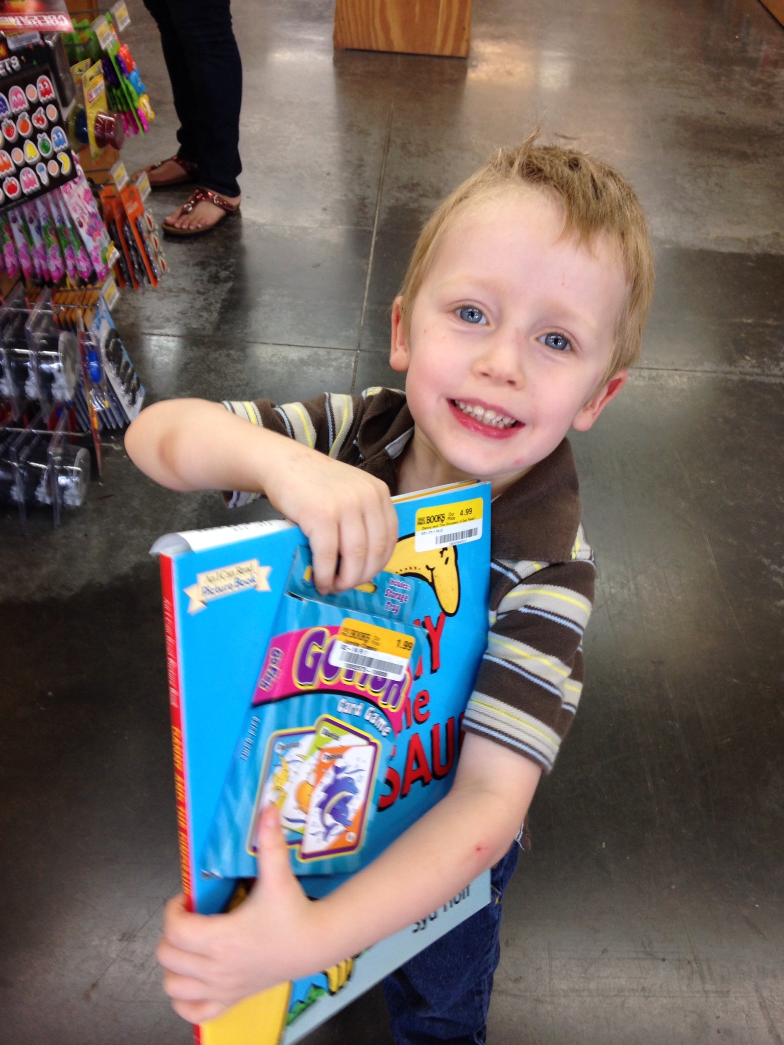 The next thing he wanted to do was to go to the bookstore, so we made our way over to Half Price Books. I love buying my kids books, but goodness gracious! The kid was everywhere pulling books off every shelf and saying we were going to buy everything he touched! He went in wanting a dinosaur book, so after we looked at pretty much every book in the kids section, I finally found one and we headed to the register (with a Go Fish game in hand too).
